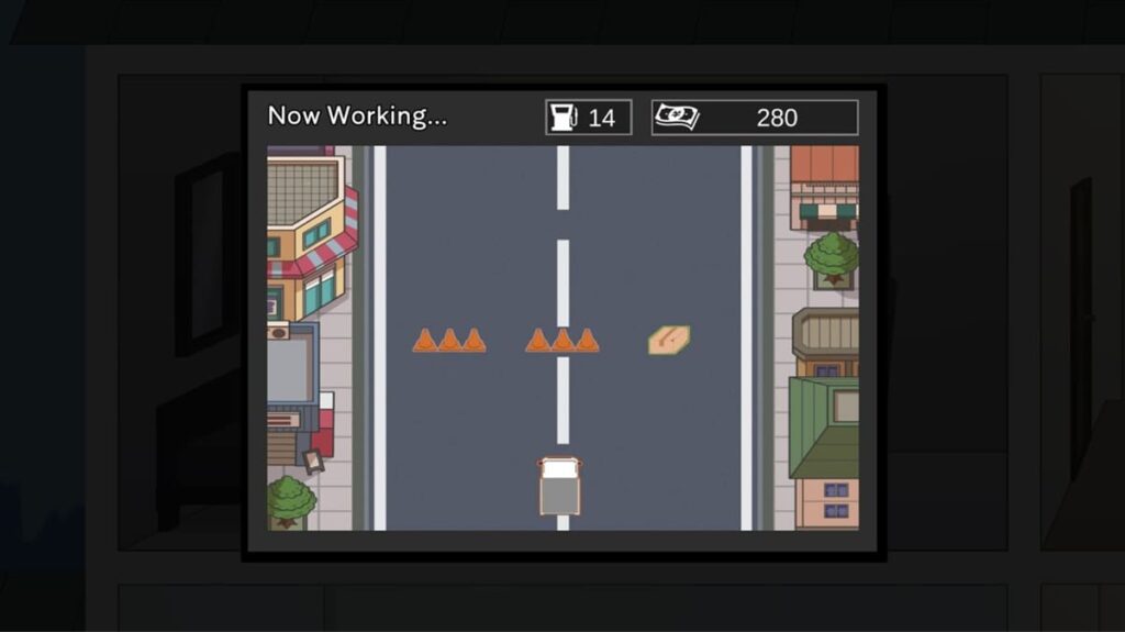 《NTR 家族》难度最高的小游戏,同样是点击型反应小游戏,利用左右键来控制车子的移动方向,需要避开路障、拾取包裹,时效收集的包裹越多,就可以赚到越多金钱。